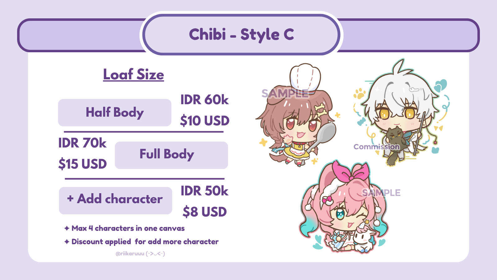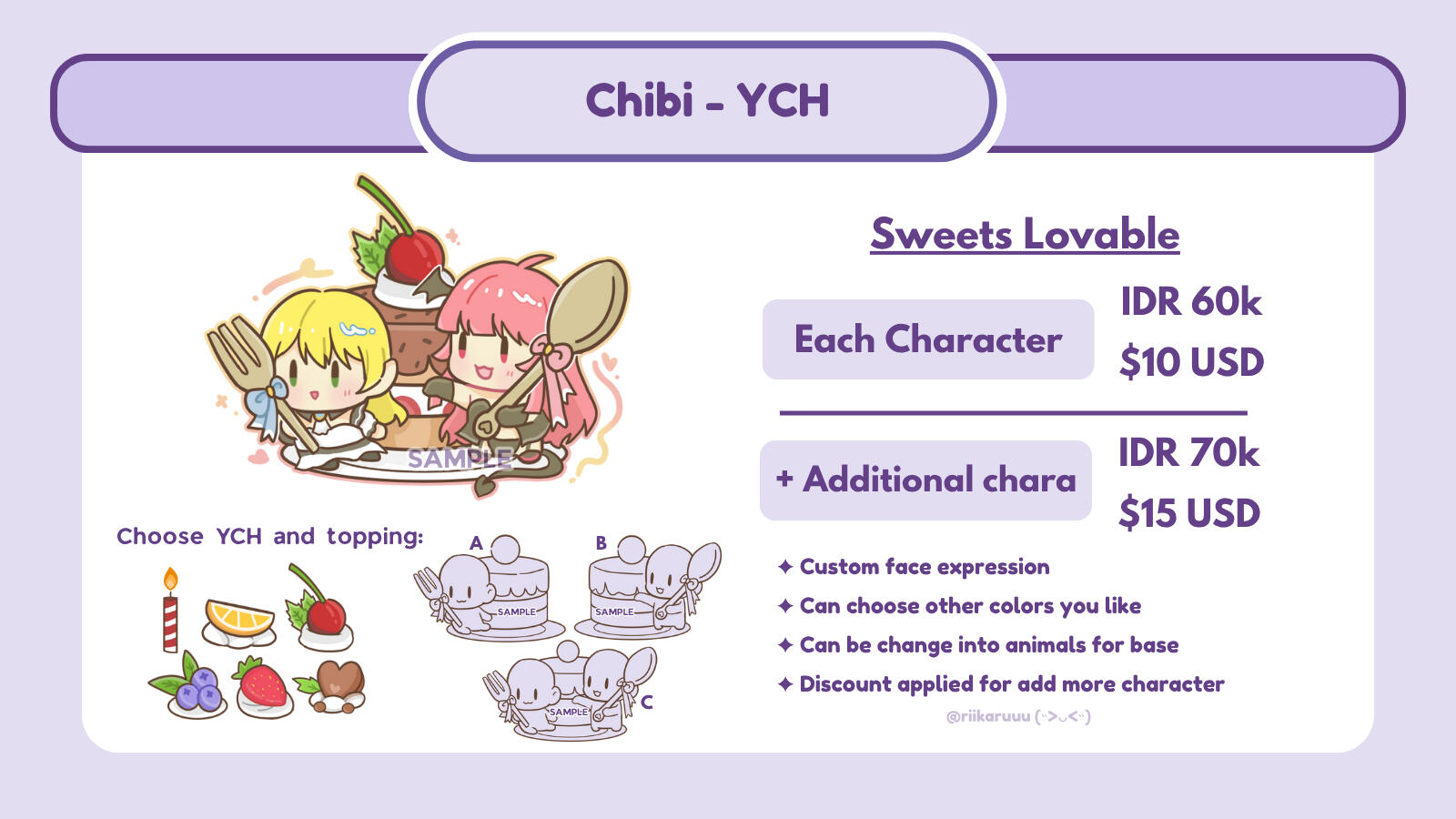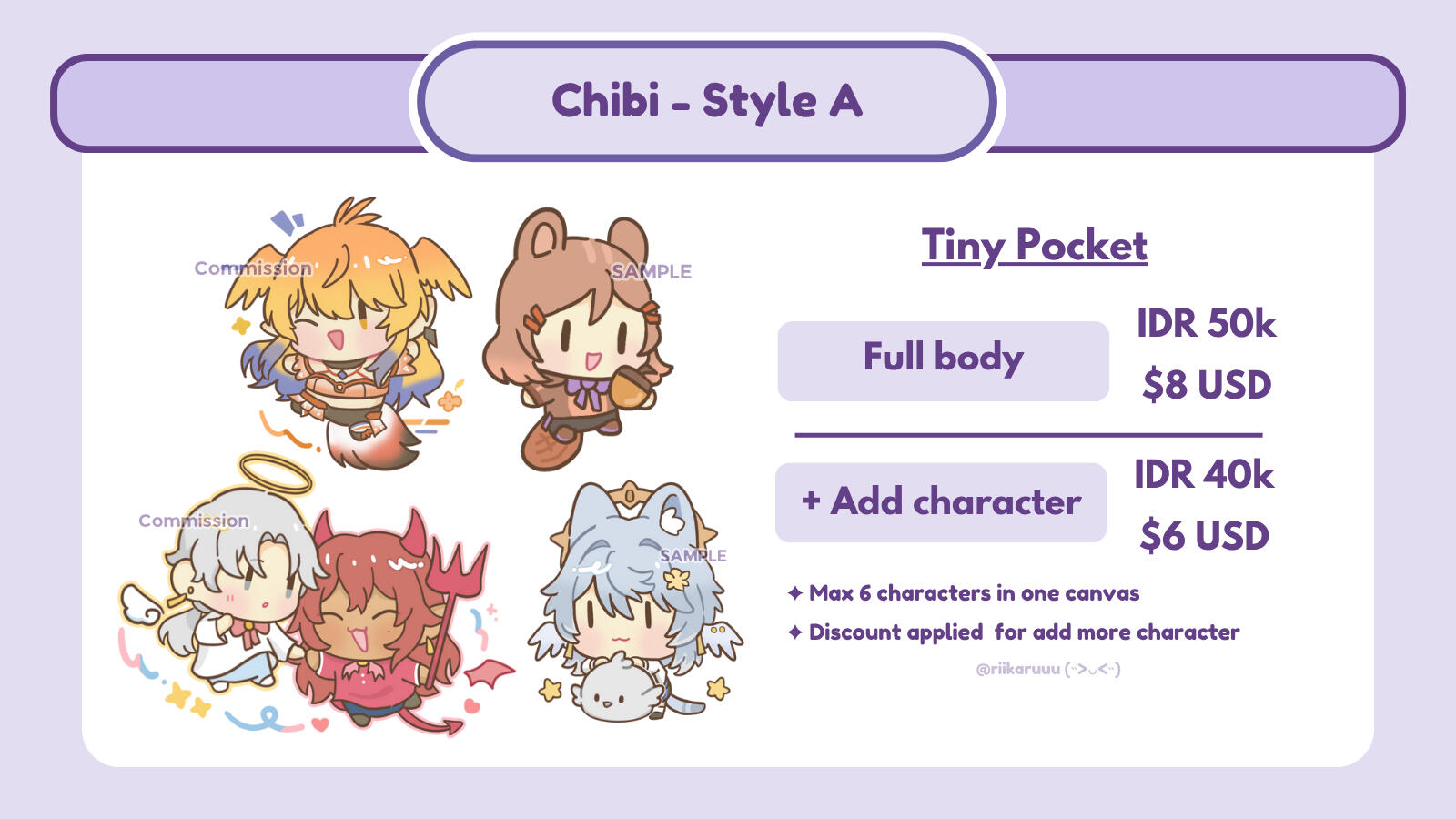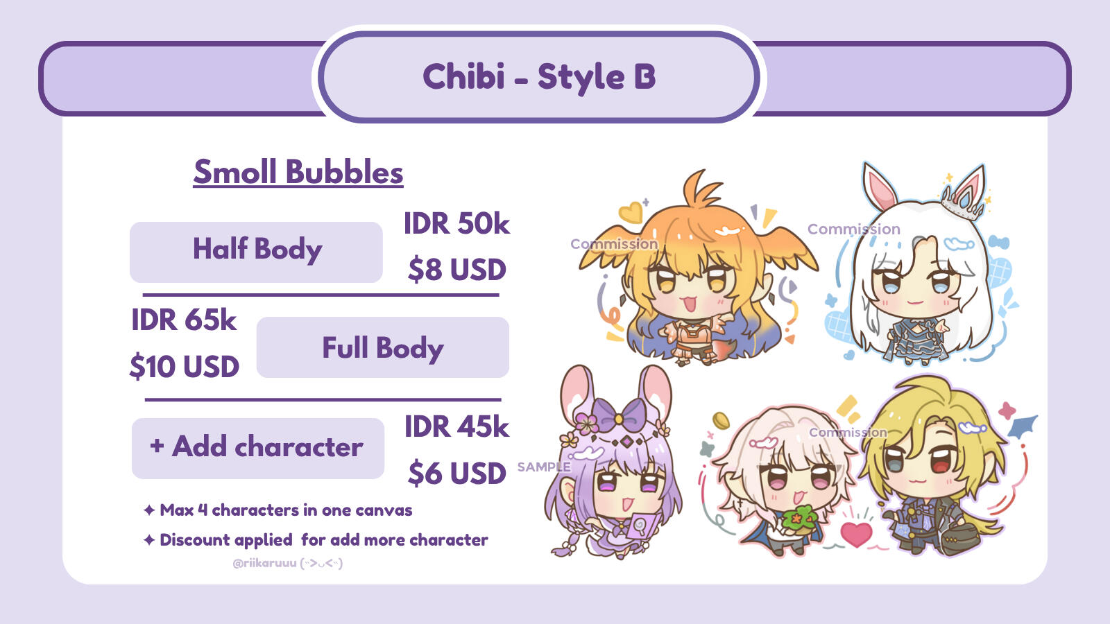 | Original Characters, Yumeship, BL/GL/HL, Fanarts, Pets, mini simple GIF animation, mascots, emotes. | Old people alike grandpa/grandma, mecha, too furry alike (draw them as mini), detail stuffs alike weapons, and also difficult carrying pose (my chibi style their hands are small) |